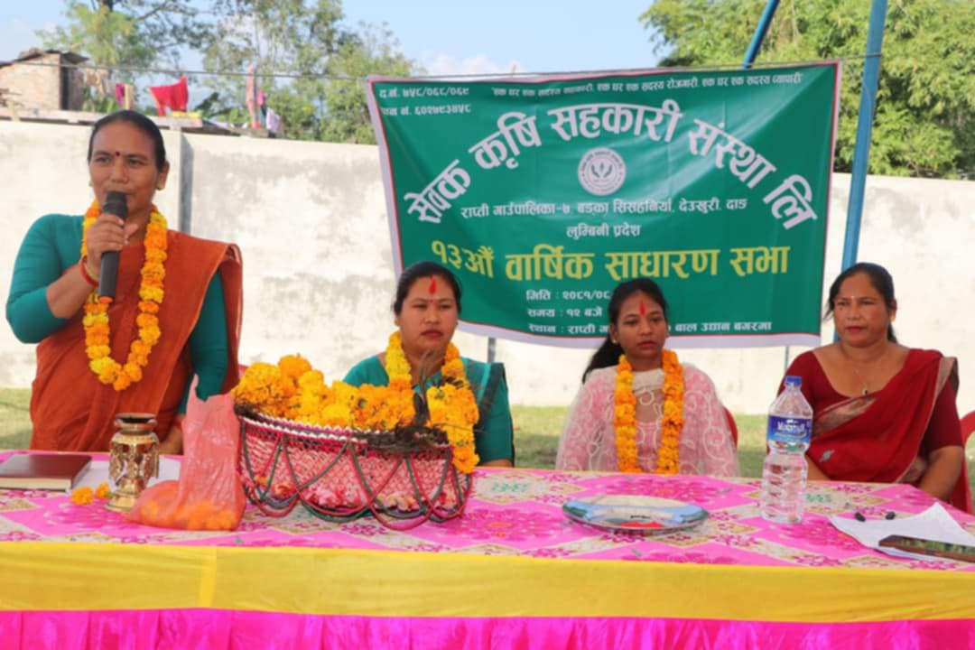 संस्थाकी अध्यक्ष सुविता चाैधरीकाे अध्यक्षता तथा राप्ती गाउँपालिकाकी उपाध्यक्ष कमलापती चाैधरीको प्रमुख आतिथ्यतामा सम्पन्न साधारणसभामा गाउँपालिकाकी उपाध्यक्ष चाैधरीले नेपाल जस्तो विकासउन्मुख मुलुकमा सहकारी क्षेत्र आर्थिक विकासको मेरुदण्ड भएकोले यसको सिद्धान्त र गरिमालाई पनि बचाएर अघि बढ्न आग्रह गर्नुभयाे ।