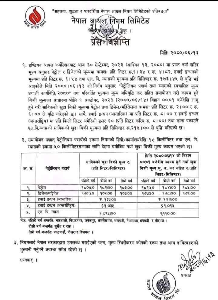 शनिबार बसेको निगम सञ्चालक समितिको बैठकले पेट्रोलमा प्रतिलिटर २, डिजेल र मट्टितेलमा प्रतिलिटर ६ र खाना पकाउने ग्यासमा प्रतिलिटर २१५ रुपैयाँ बढाउने निर्णय गरेको हो ।
