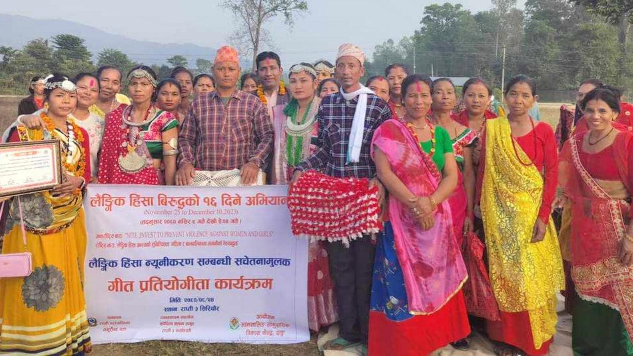 दाङ २५ मंसिर । नामसालिङ सामुदायिक विकास केन्द्र दाङकाे आयाेजना तथा राप्ती गाउँपालिकाकाे समन्वयमा लैङ्गिक हिंसा विरूद्धकाे १६ दिने अभियान अन्तर्गत ” लैंगिक हिंसा न्यूनीकरण ” सम्बन्धी सचेतनामुलक लाेक गीत प्रतियोगिता आइतबार राप्ती गाउँपालिका ३ नयाँ बस्तीमा सम्पन्न भएकाे छ ।