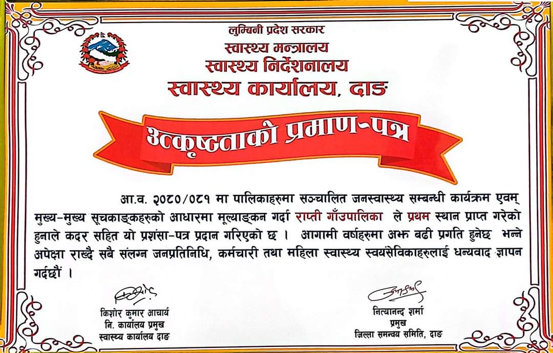 स्वास्थ्य कार्यालय दाङको आर्थिक वर्ष २०८०/०८१ को वार्षिक समिक्षा कार्यक्रममा राप्ती गाउँपालिकालाई उत्कृष्ट घोषित गरेको हो । अन्य पालिकामध्ये राप्ती गाउँपालिकाले स्वास्थ्यका विभिन्न सूचकहरु गत वर्षको कार्यक्रममा सबै भन्दा राम्रो बनाएको आधारमा एक कार्यक्रमका बीच उत्कृष्ट भएको घोषणा गर्दै प्रमाण पत्र प्रदान गरिएको छ ।