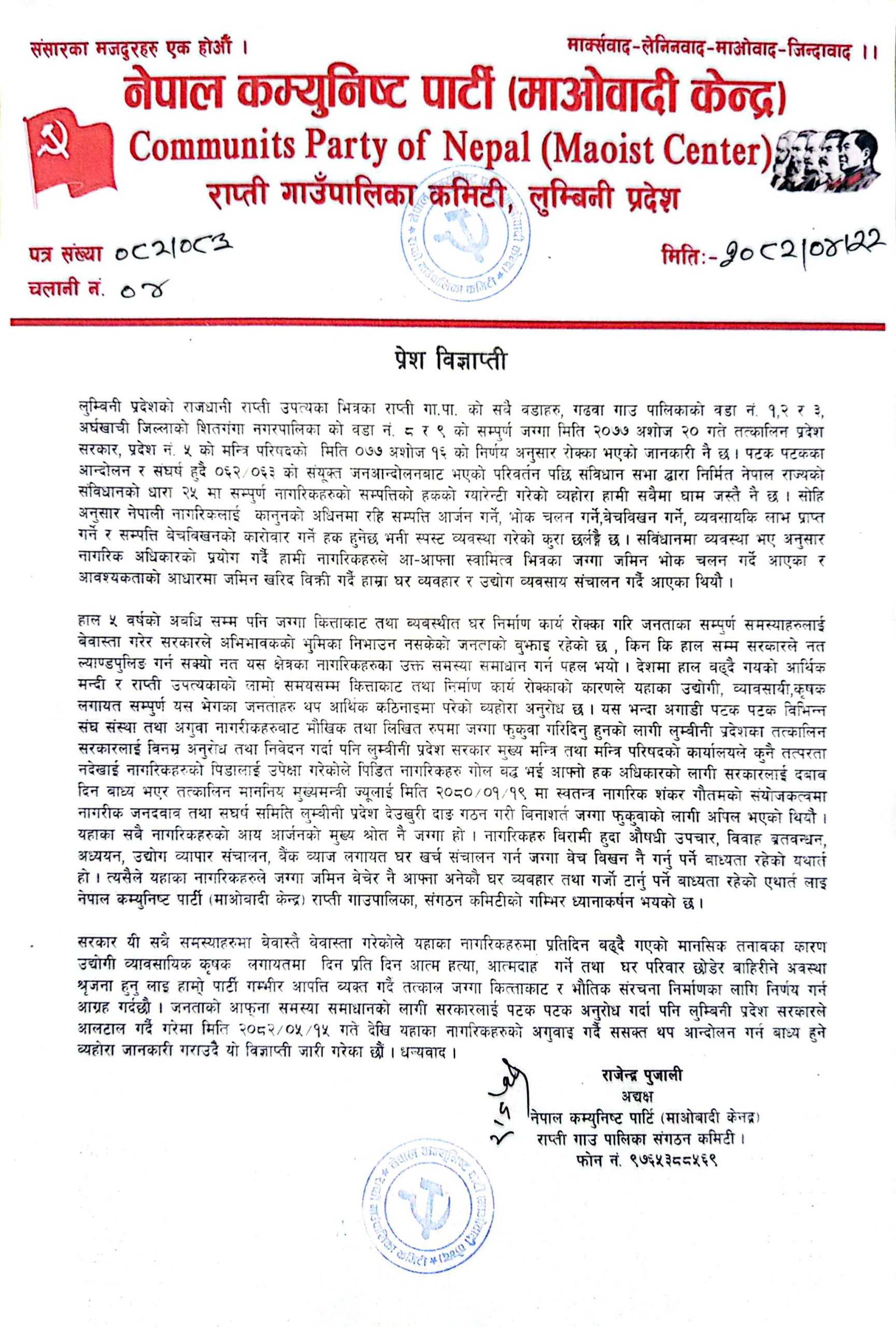 पार्टीले बिहीबार राप्ती गाउँपालिका–४ मौरीघाटमा पत्रकार सम्मेलन गरी उक्त माग राख्दै, माग पूरा नभए आगामी भदौ १५ गतेदेखि सशक्त आन्दोलनमा उत्रिने चेतावनी दिएको हो । पार्टीले आन्दोलनमा सबै पक्षको एकता र साथ पनि आह्वान गरेको छ ।