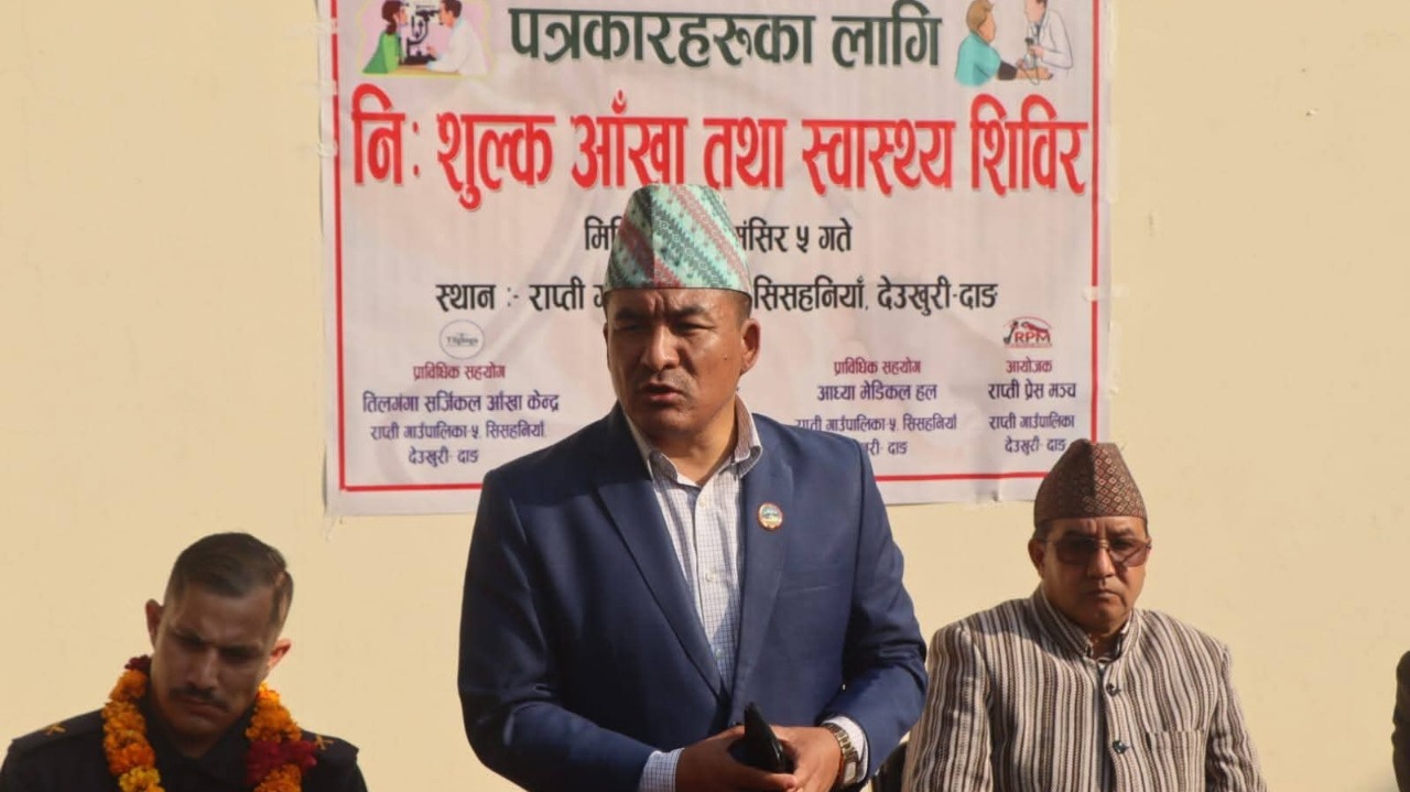 तिलगंगा सर्जिकल आँखा केन्द्र र आध्या मेडिकल हलको प्राविधिक सहयोगमा राप्ती प्रेस मञ्चले शुक्रबार दाङको राप्ती गाउँपालिका–५ सिसहनियाँमा आयोजना गरेको पत्रकारहरुको नि:शुल्क आँखा तथा स्वास्थ्य जाँच शिविरको उद्घाटन गर्दै उनले प्रभावकारी र सुलभ स्वास्थ्य सेवा सुनिश्चित गर्न सरकार निरन्तर कार्यरत रहेको स्पष्ट पारेका हुन् ।