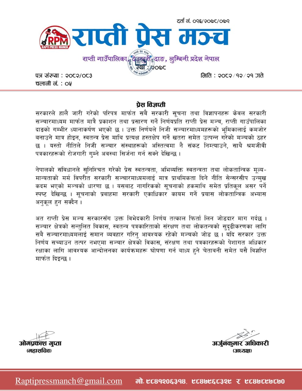 राप्ती प्रेस मञ्चले सरकारसँग उक्त विभेदकारी निर्णय तत्काल फिर्ता लिन जोडदार माग गरेको छ । सञ्चार क्षेत्रको सन्तुलित विकास, स्वतन्त्र पत्रकारिताको संरक्षण तथा लोकतन्त्रको सुदृढीकरणका लागि सबै सञ्चारमाध्यमलाई समान व्यवहार गरिनु आवश्यक रहेको मञ्चले जोड दिएको छ ।
