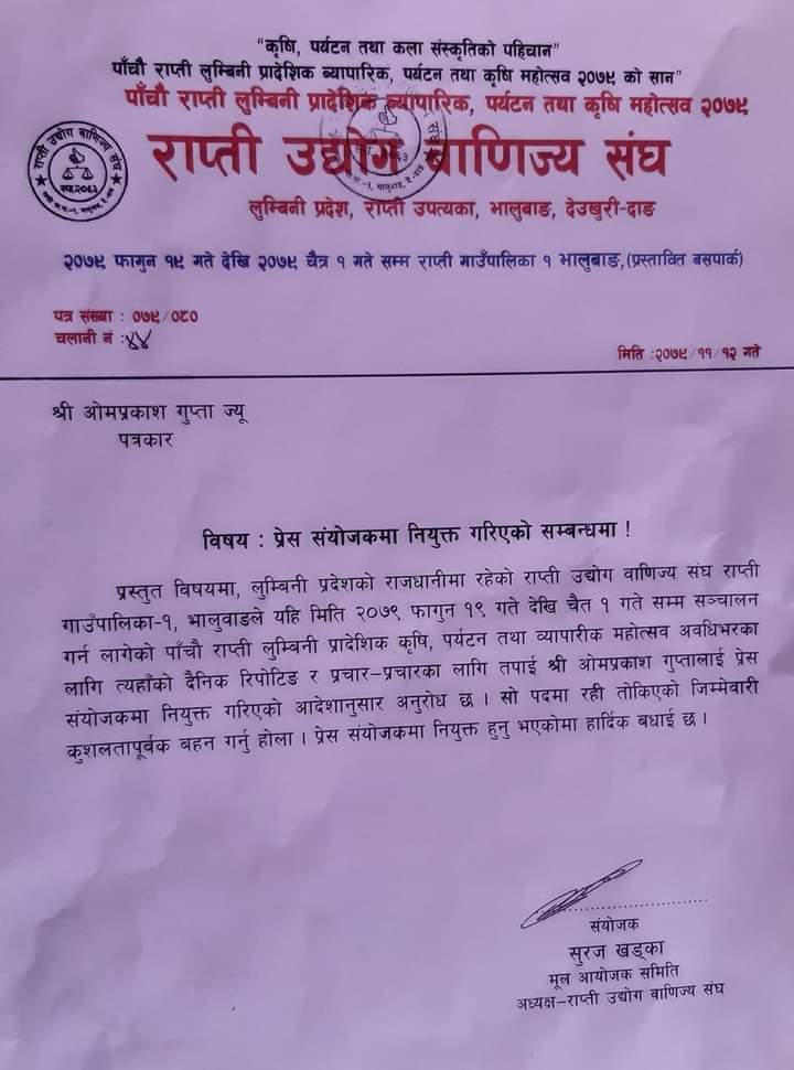 भालुबाङ । देउखुरीकाे भालुवाङमा हुन गईरहेकाे पाँचाैँ राप्ती लुम्बिनी प्रादेशिक व्यापारिक, पर्यटन तथा कृषि महोत्सव २०७९ का प्रेस संयाेजकमा देउखुरी टुडे डटकमका कार्यकारी सम्पादक ओमप्रकाश गुप्ता नियुक्त भएका छन् ।